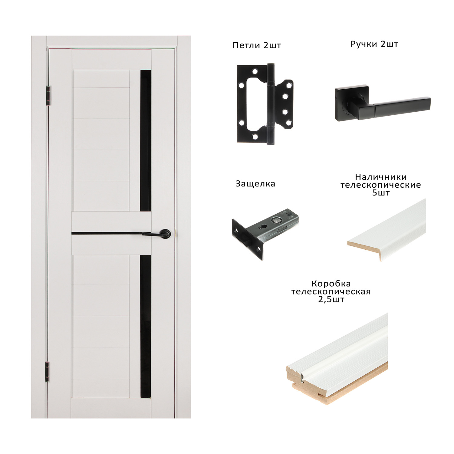 Дверь межкомнатная, петли - 2 шт, ручки - 2 шт, защелка, телескопическая коробка, телескопические наличники - 5 шт