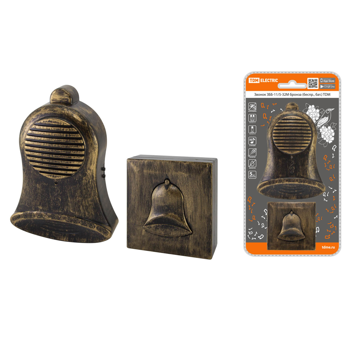Звонок беспр.на батар. ЗББ-11/5-32М 32 мелодий, кнопка IP30,3х1,5В АА бронза TDM SQ1901-0029*1