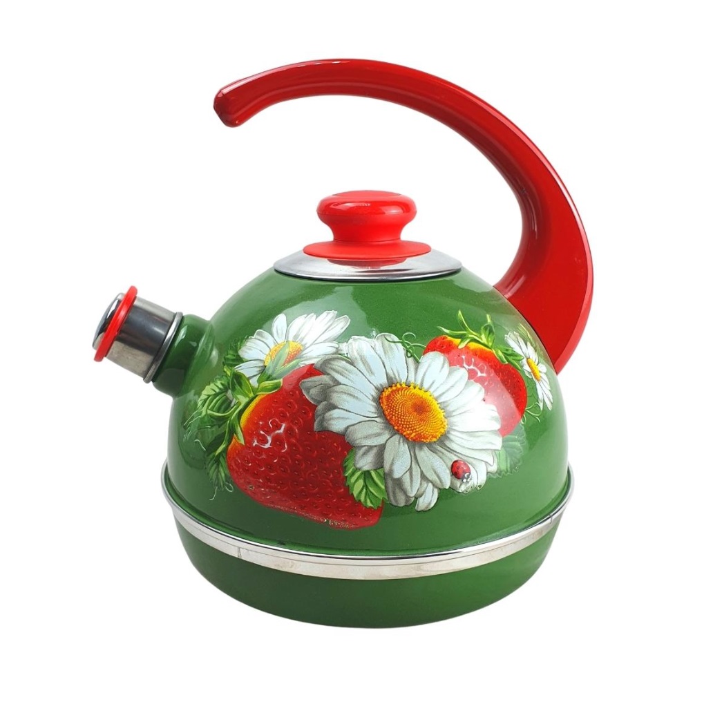 яяяЧайник эмалированный со свистком 3,5л декор "Клубника с ромашкой" Зеленый T04/35/07/05/H13 *1/4