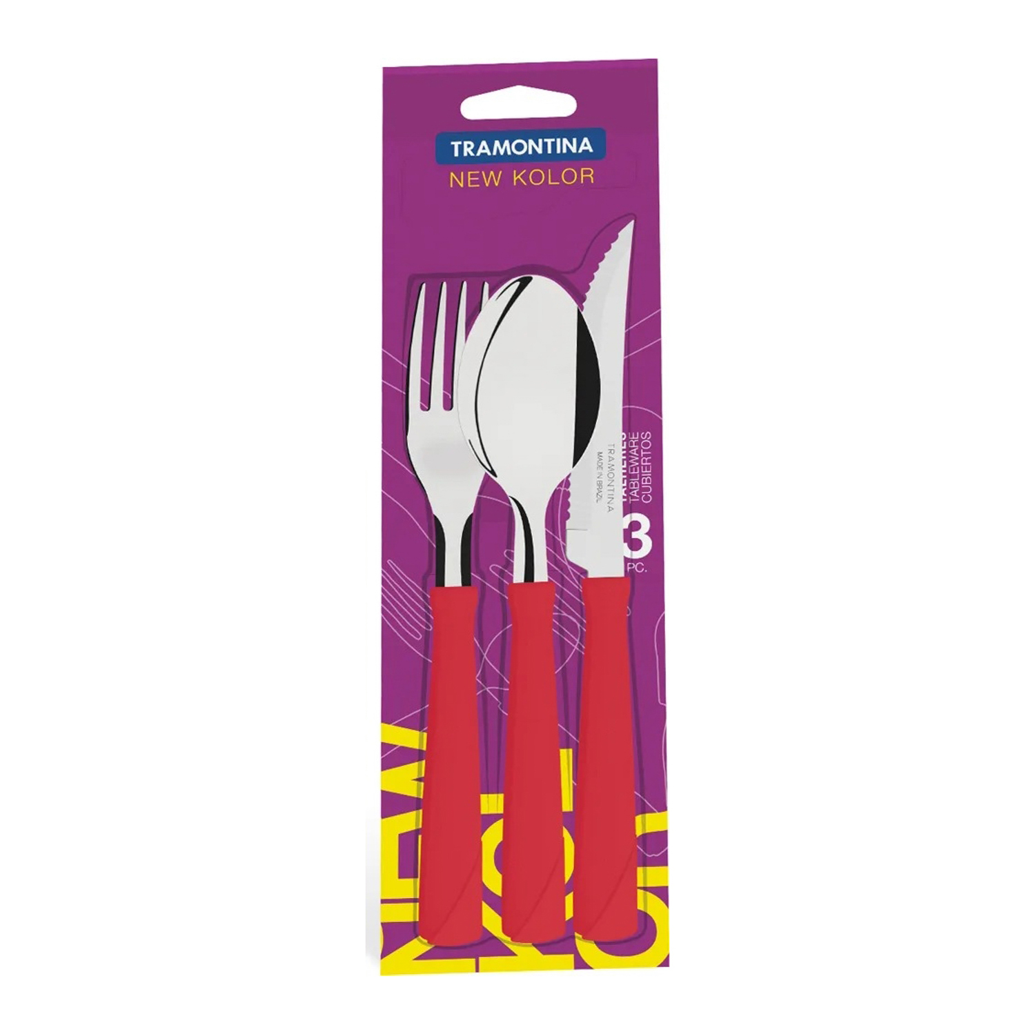 Набор столовых приборов Tramontina "New Kolor" изготовлен из высококачественной нержавеющей стали AISI 420. Толстая сталь и усиленное крепление рукоятки заклепками гарантируют сохранность в течение многих лет. При производстве особое внимание уделяется окончательной обработке, что предохраняет от риска пораниться о края изделия. Рукоятки серии "New Kolor" выполнены из полипропилена, долговечны, выдерживают температуру до 130°C.