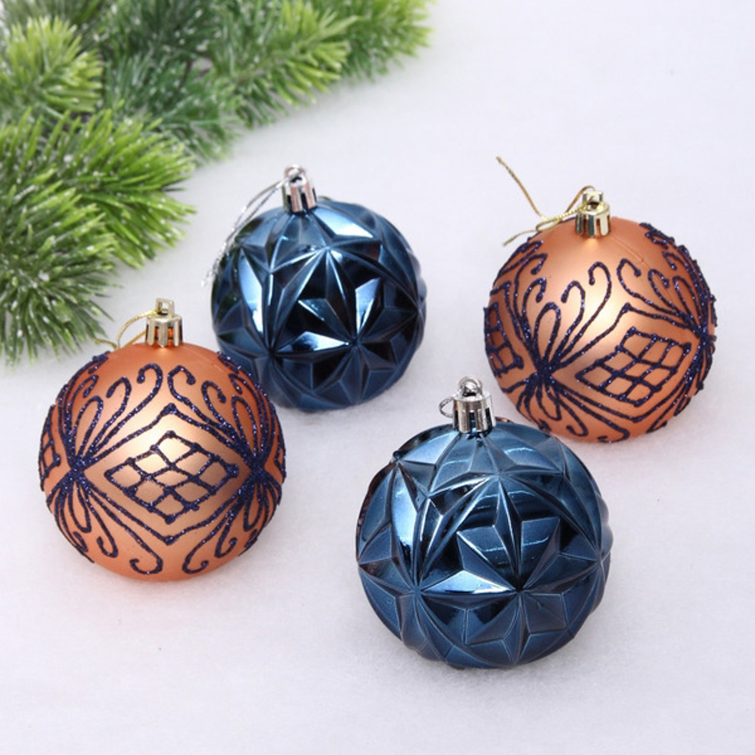 Новогодние шары 7 см (набор 4 шт) "Симфония леса", сапфир/шампань