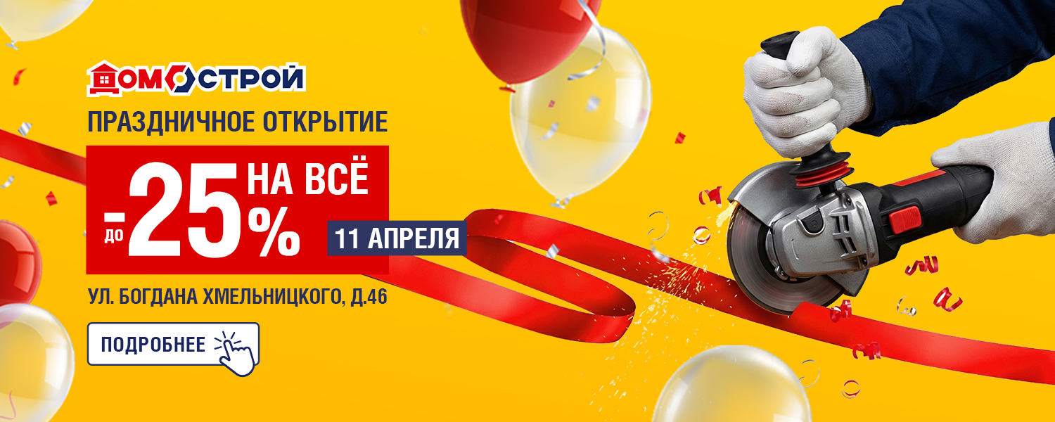 Празднуем открытие нового магазина ДомоСтрой в Миассе 11 апреля по адресу ул. Богдана Хмельницкого, д.46! И в честь этого праздника дарим скидку до -25%.